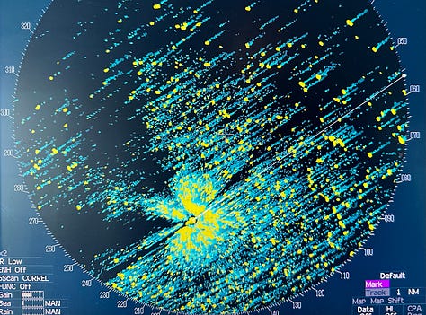 A monitor on the ship’s bridge illuminates the X-band radar pings of surrounding icebergs. The dots are so numerous it appears as if we’re sailing through a celestial mist of LED stars. We’ve just crossed 82° North and the Arctic Ocean heaves with bright ice that radiates an unsettling clicking noise.